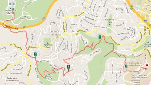 You can start anywhere on the loop, but parking at the zoo seems like a good idea if you want to take the cheaper counter-clockwise direction for the loop. We started hiking at about 2:40pm and started out ascent to Council Crest Park, the highest point Portland. We tracked the hike using RunKeeper and the hiking portion turned out to be about 4.3 miles and we completed in just over 90 minutes. We hiked at a very brisk pace so your timing might be slower if you stop to check out the views or climb at a more leisurely pace.