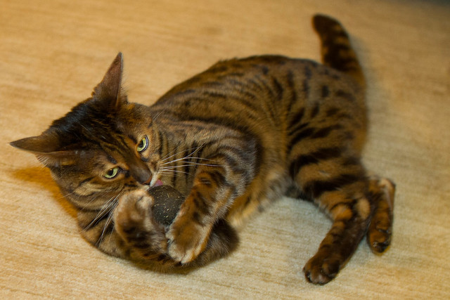 We gave the cats some super-concentrated black tar catnip ball that resulted in a crazy Christmas show by the cats. They were fighting over access to the ball and Gabby ended up rolling around with it for five minutes licking it non-stop.