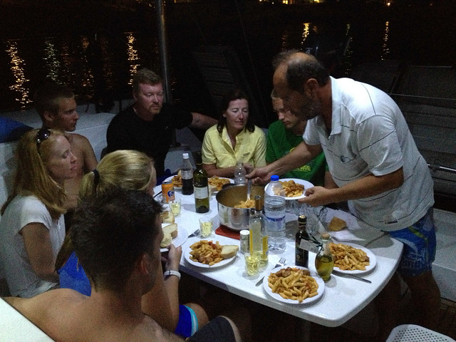 We returned via bus to the port then paddle back to our boat for a wonderful Greek dinner prepared by our master chef and skipper. These are the moments we cherish - a prepared meal with local wine and engaging conversation.