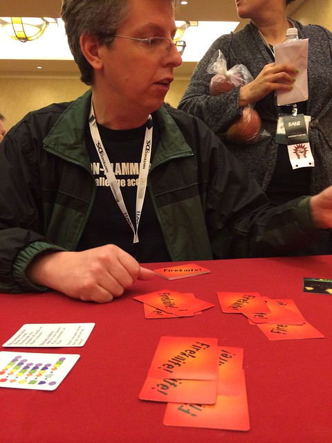 Peter Drake sat with us as we were finishing our game and offered to teach me his new game design Fireknife! This is a light multiplayer press-your-luck and climbing game with some similarities to KC's Havoc: the Hundred Years War that we released about 9 years ago. Players are Samoan fire knife dancers attempting to put on the most impressive dance. Players draw or exchange cards trying to collect a good set of dance move cards until someone decides to start dancing. This is where the game deviates from other climbing games: each card played by another player can only be followed (or in some cases preceded) by a specific type of card. For example, a knife toss must be followed by a knife catch. The finale must be the last card played. Players take turns playing a single card at a time (they can also opt of the dance if they want to observe) until everyone passes.