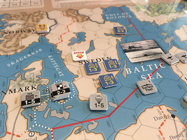 Strategically this was a terrible move. With only a single surface fleet to carry my amphibious assault, I was forced to rely on just one corps landing along with an airborne drop. I had less than a 50/50 chance of succeeding, failed, and the entire operation was a bust. I did this as my last action just so Ken and I could see both an amphibious assault and an airborne drop and work through the rules. At least that's my excuse.