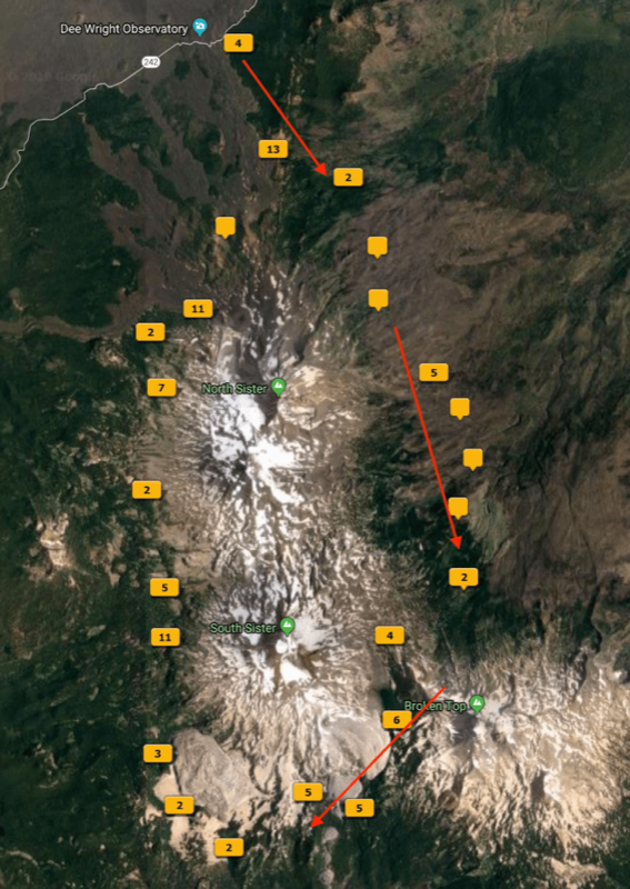 We did the loop clockwise, parking at Lava Camp Lake trailhead and hiking in from there on a Thursday night to start the loop. The loop hikes all look like a lollipop with the stick depending on where you enter. Lightroom will show a geotagged photo collection set in a map interface, creating a nice top-down view of what the hike path was.